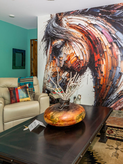 This room at once ties you to the old west and connects you to nature. Custom leather recliners and beautiful original western art assure a warm inviting welcome. You are Instantly aware of being in the most comfortable, relaxing, put your feet up room this side John Wayne’s living room. Comfort is your keeper and peace your bodyguard. All this brings to you a spiritual sense of wellbeing that will serve as one of your lasting memories of this remarkable retreat.