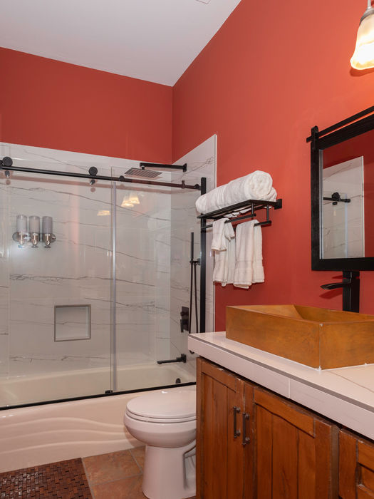 Entering this amazing space is a journey to exotic Morocco. Decorated with authentic handmade Moroccan furniture that boasts striking patterns and bold colors. The shower tiles and sink reflect the Berber traditions and historic Moroccan design and culture. At the end of your day’s activities, settle in and let the magic of this beautiful space evoke images of the Arabian nights for a truly restful sleep.